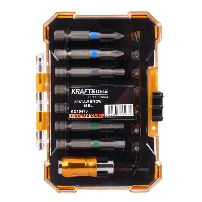 Setul de biți, 15 piese | KD10473 conține diverse tipuri de accesorii de înșurubare, potrivite atât pentru uz casnic, cât și profesional. Datorită durabilității, fiabilității, preciziei, materialelor de înaltă calitate, soluțiilor de design moderne și altor avantaje, va satisface cu siguranță chiar și cei mai exigenți utilizatori. Setul este livrat într-un pachet practic care permite o prezentare generală rapidă a sculelor disponibile.