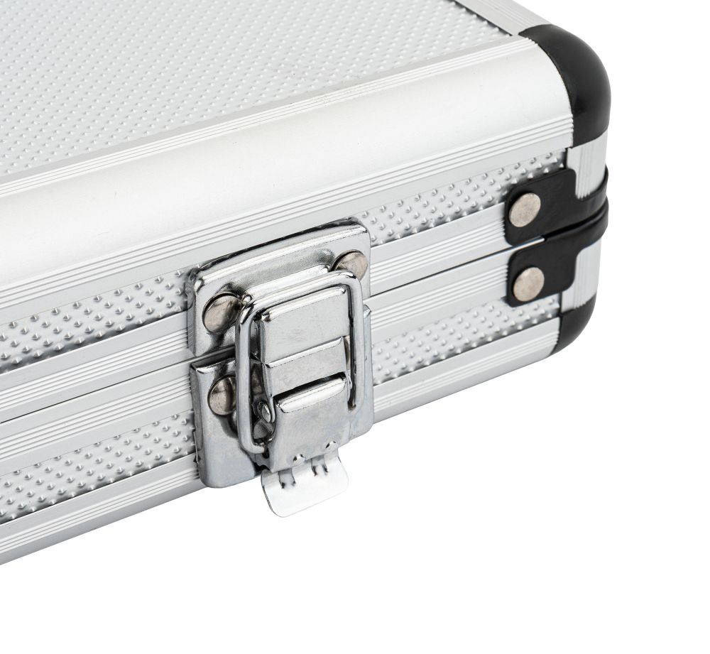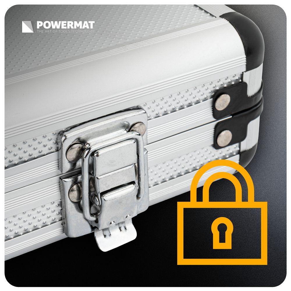 Întregul set este depozitat într-o geantă practică de transport. Fiecare articol are propriul său loc, ceea ce îl face ușor de organizat. Beneficiați de ordine, depozitare sigură și transport convenabil pentru fiecare lucrare. Geanta este echipată cu o încuietoare pentru a securiza conținutul în timpul transportului și depozitării. Acest lucru garantează că unealta nu se va deschide sau nu se va vărsa în timpul transportului. Beneficiați de liniște sufletească, ordine și certitudinea că întregul set este închis în siguranță.
