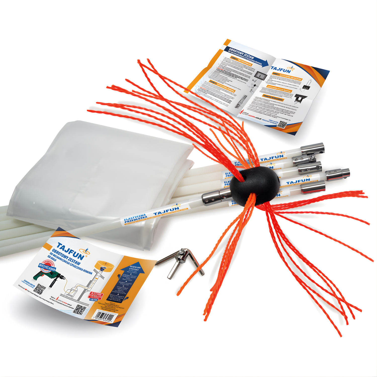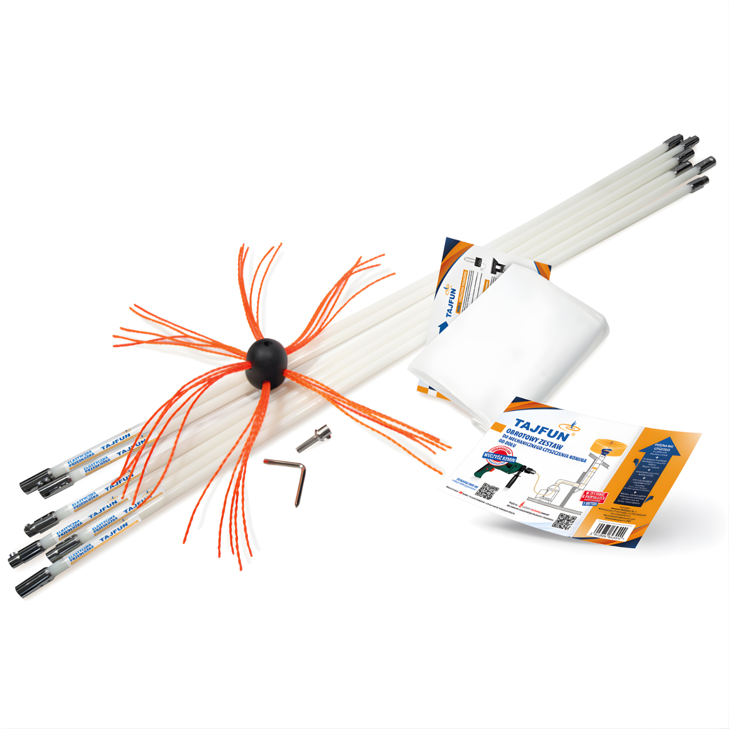 Setul de curățare a coșului de fum, 6m | TAJFUN vă permite să curățați rapid și ușor țevile de coș în confortul casei dumneavoastră. Vă permite să îndepărtați depunerile de funingine și creozot de pe coșurile de fum din cărămidă, ceramică și metal, menținând țevile de coș complet curate. Acest set combină ușurința în utilizare cu eficiența maximă și, datorită extensiilor sale flexibile, ajunge în fiecare colț al coșului de fum.