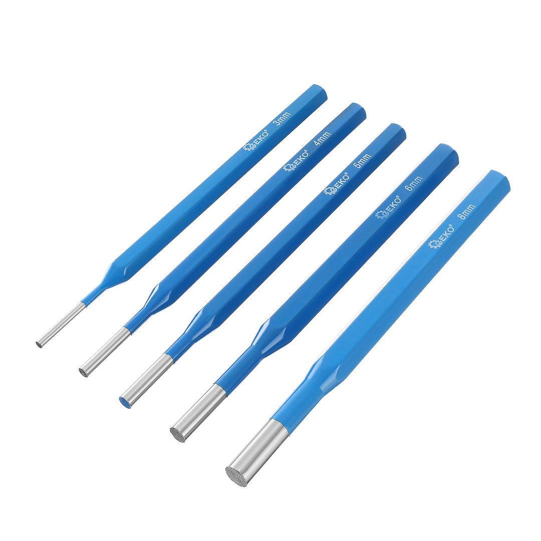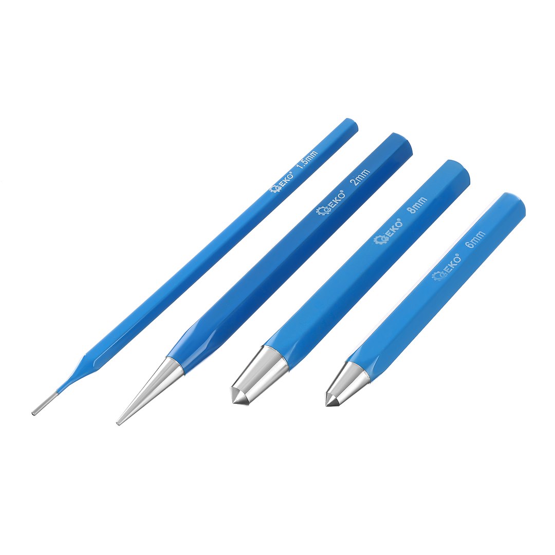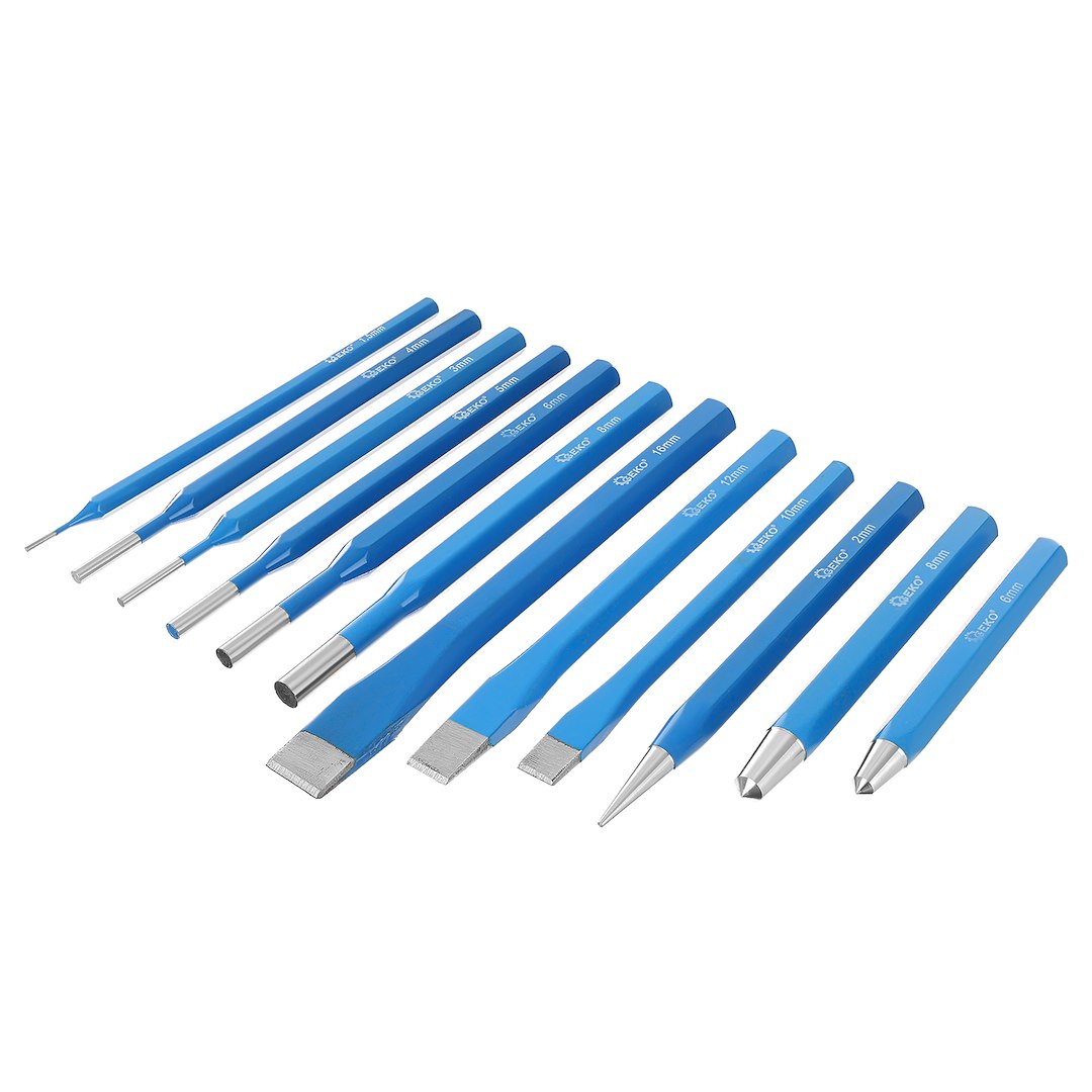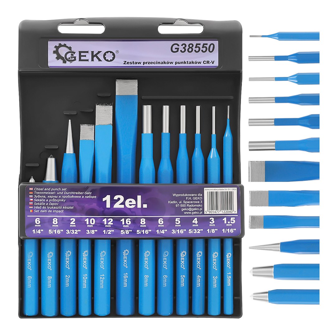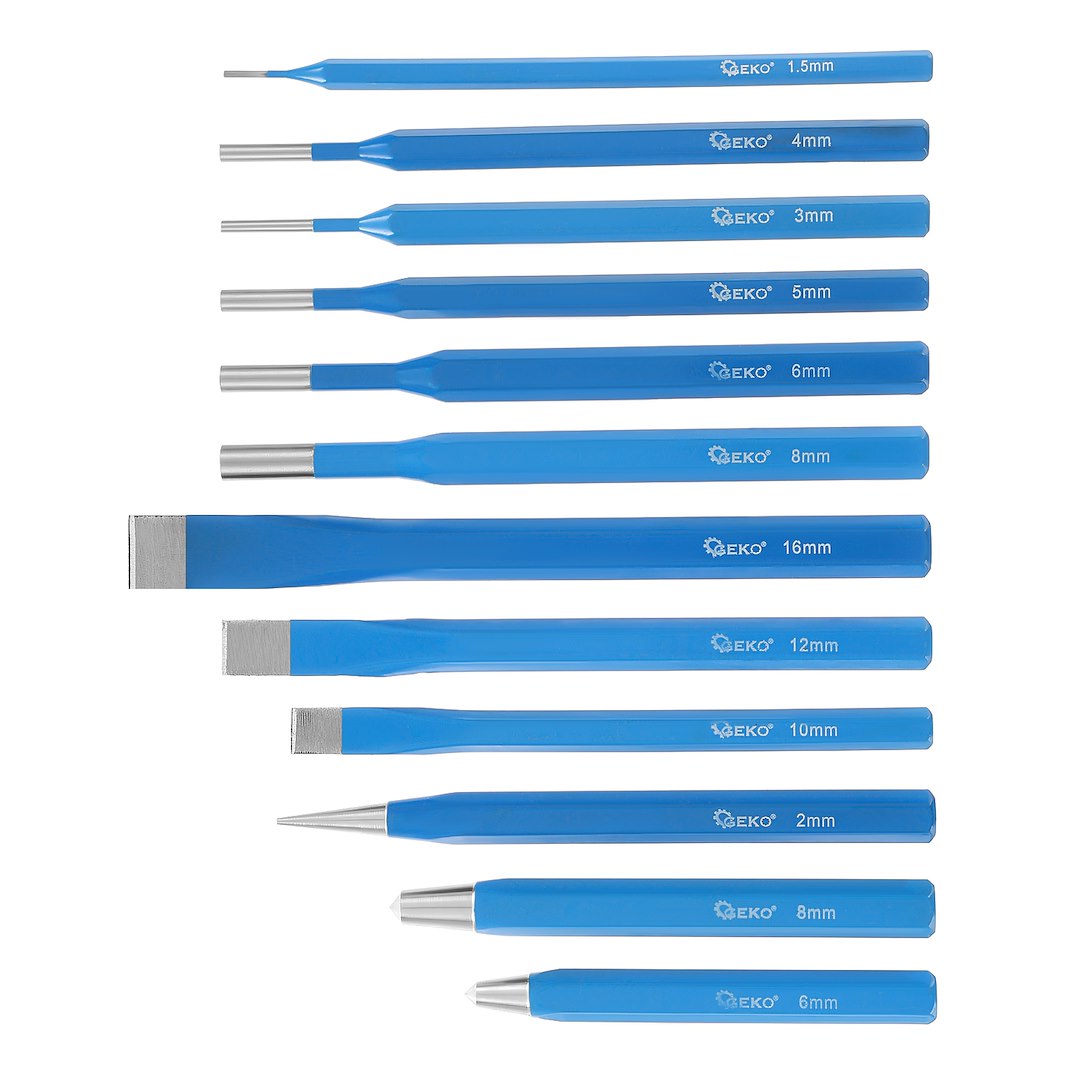 Setul de perforatoare, 12 buc, CR-V | GEKO este util pentru marcarea centrului găurilor înainte de găurire, tăiere table și bare și perforarea elementelor metalice. Setul de dălți, perforatoare și perforatoare de centru este fabricat din oțel crom-vanadiu. Este un set ideal pentru lăcătuși și mecanici.