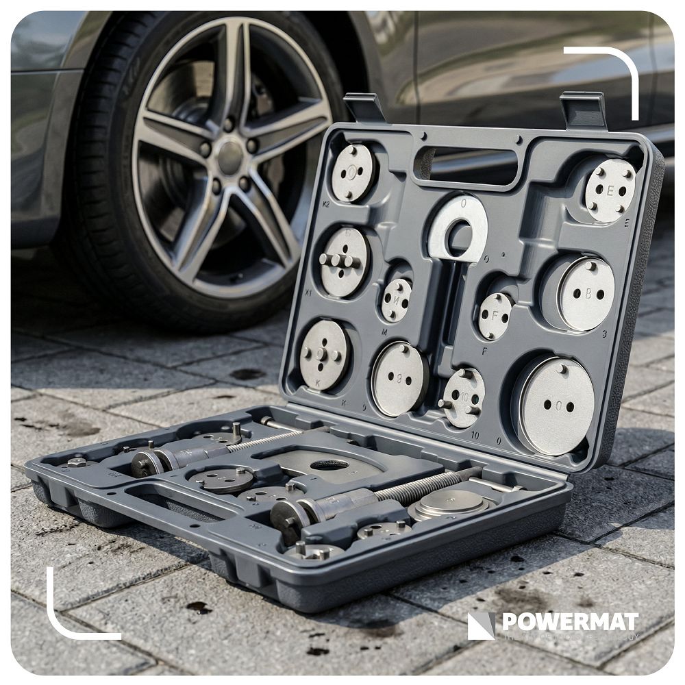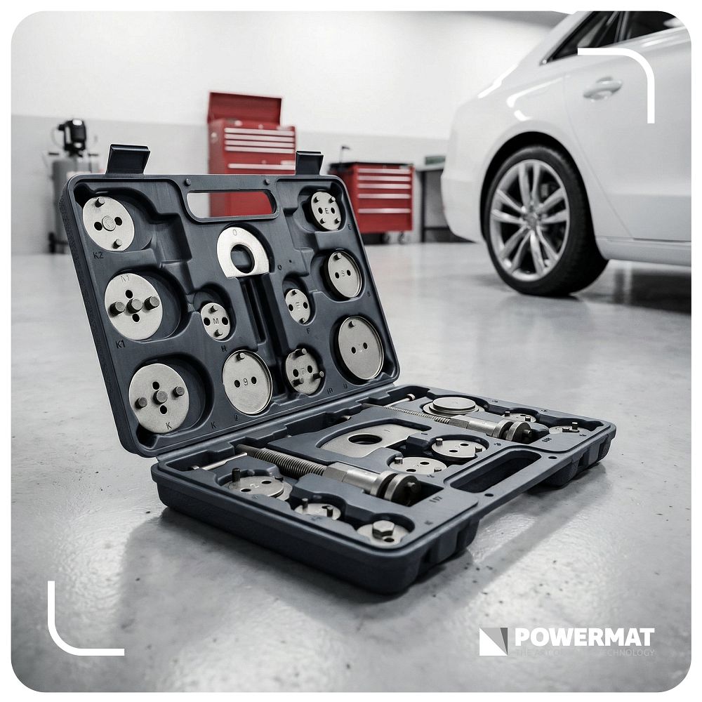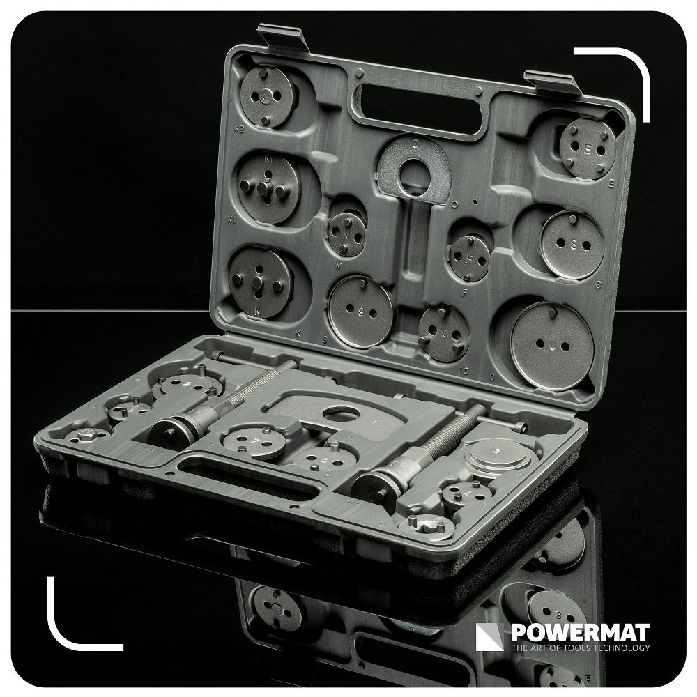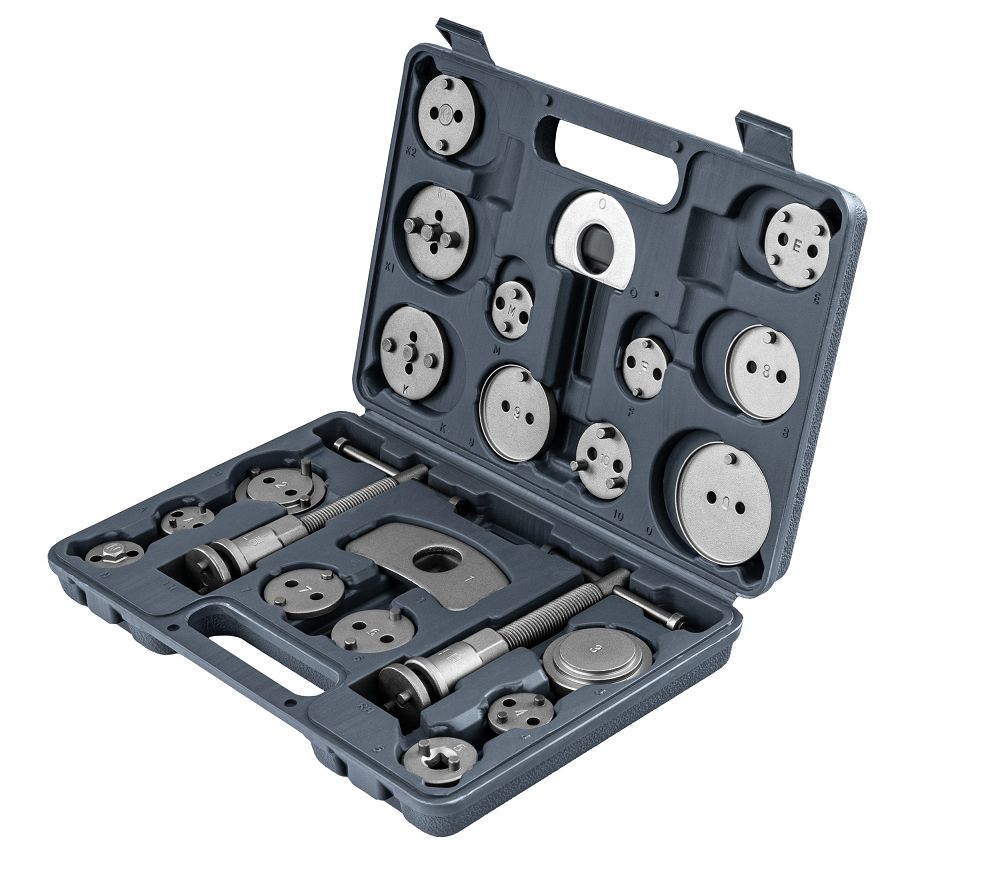 Setul de presare pistoane de frână, 22 buc | PM-ZWT-22T include unelte pentru presarea pistoanelor la înlocuirea plăcuțelor de frână. Datorită numeroaselor adaptoare, puteți adapta unealta la diferite modele. Presele pentru dreptaci și stângaci cresc confortul în lucru. Beneficiați de precizie, economie de timp și un risc mai mic de deteriorare. Filetele pentru dreptaci și stângaci vă permit să lucrați în conformitate cu designul pistonului, fără riscul de deteriorare. Datorită acestui fapt, efectuați service-ul cu precizie și fără efort inutil.