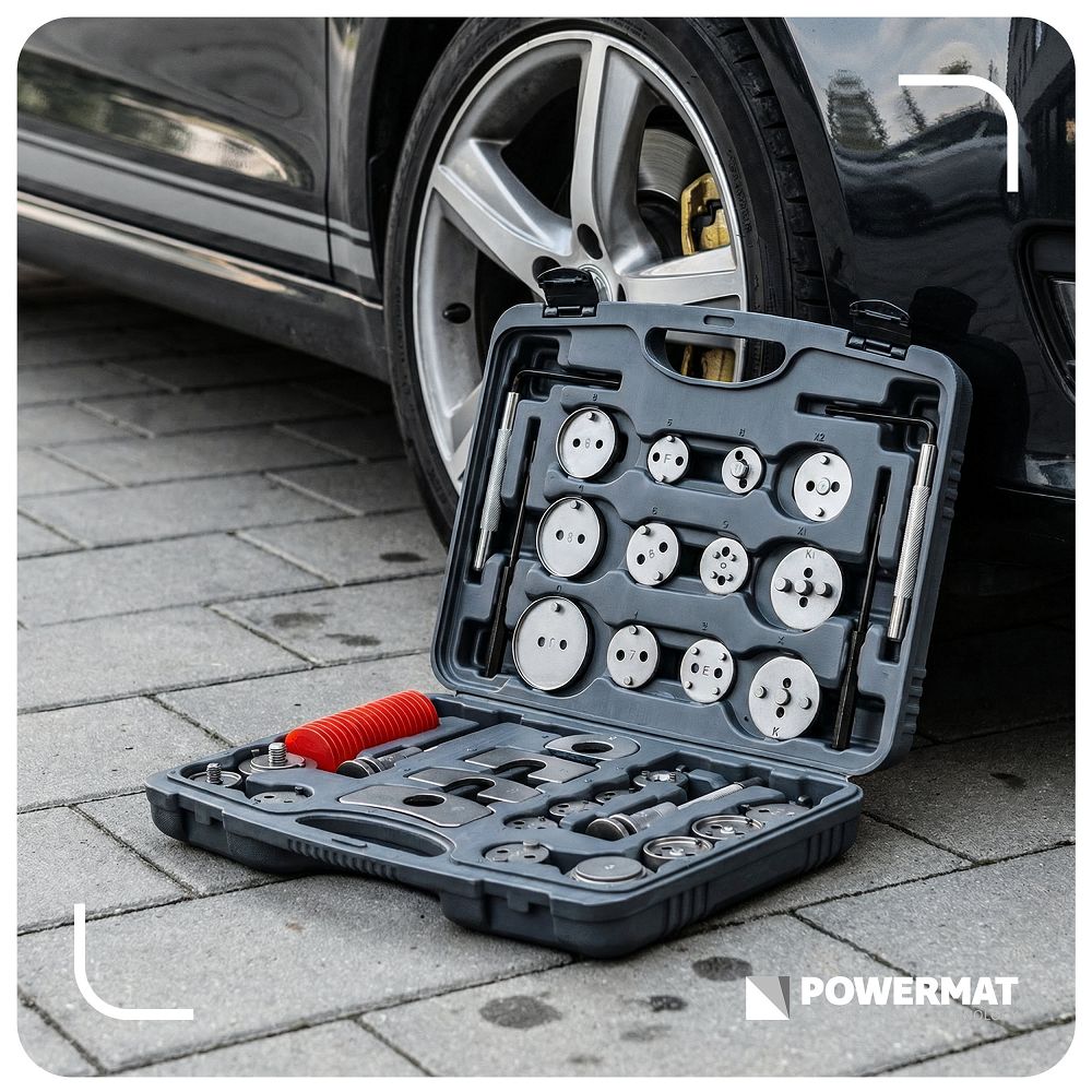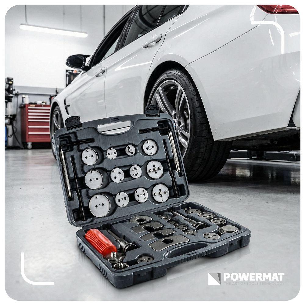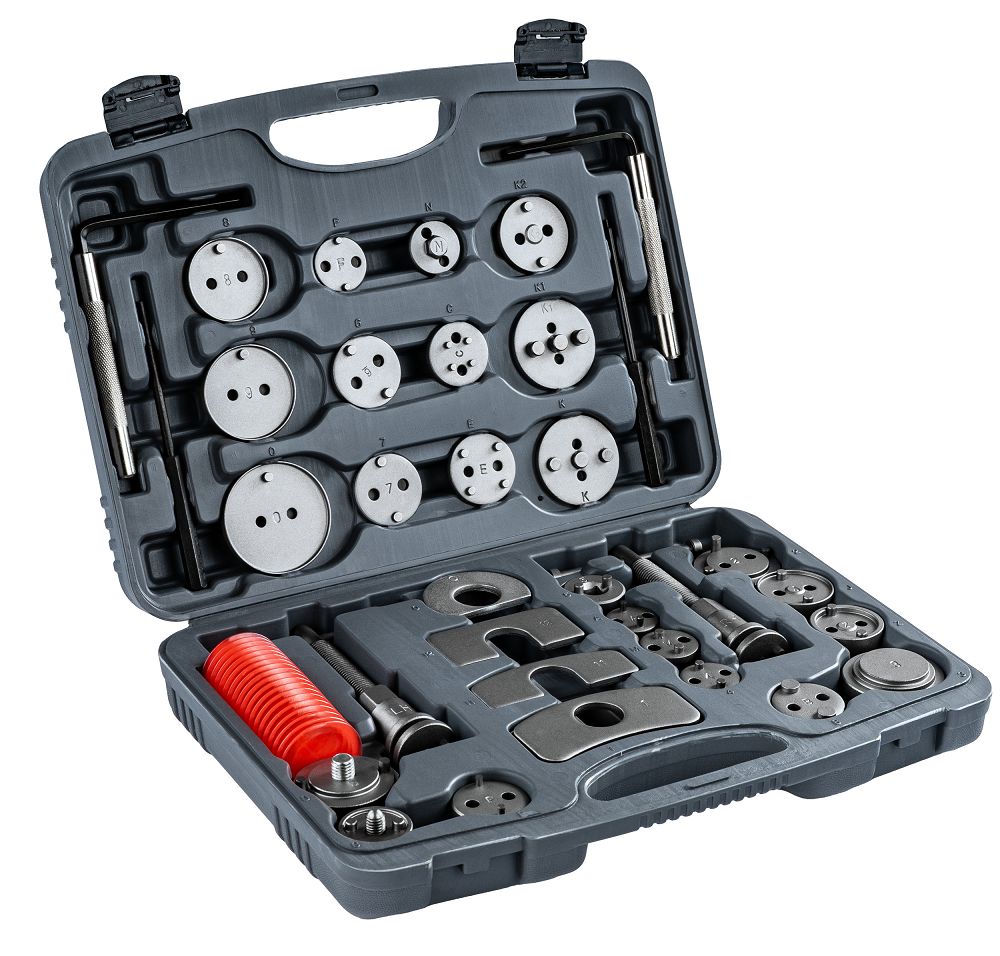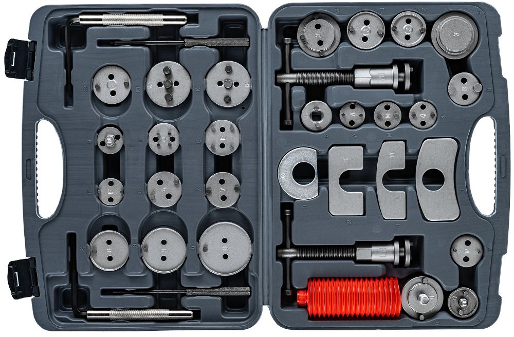 Setul de presare piston frână, 35 buc | PM-ZWT-35T conține instrumente practice pentru service-ul sistemului de frânare al mașinii dumneavoastră. Datorită celor 35 de piese, inclusiv adaptoare și prese pentru partea dreaptă și stângă, îl puteți adapta la multe modele. Obțineți o muncă precisă, o instalare mai ușoară a plăcuțelor de frână și economisiți timp fără riscul de deteriorare. Datorită celor 28 de adaptoare, puteți adapta cu ușurință instrumentul la diferite etriere de frână. Obțineți o soluție universală și nu pierdeți timpul combinând piese nepotrivite.