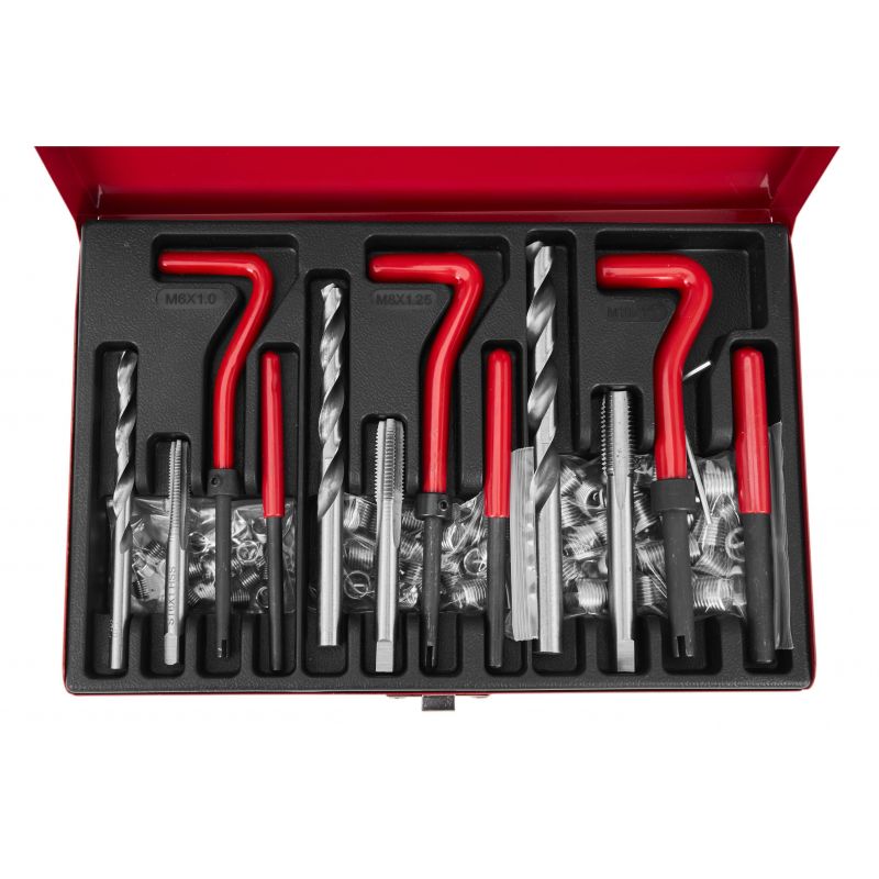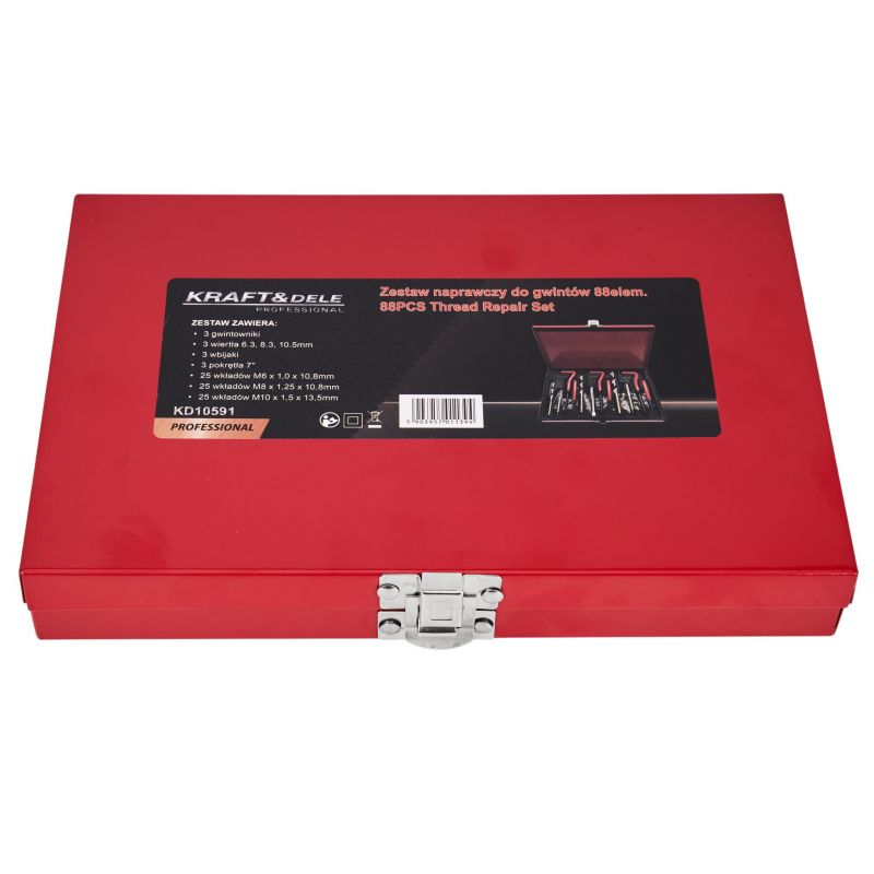Setul de reparare filete, 88 buc | KD10591 conține elemente fabricate din oțel călit de cea mai înaltă calitate, care își va dovedi eficacitatea în fiecare atelier și garaj. Setul este utilizat pentru repararea îmbinărilor filetate de toate tipurile în majoritatea materialelor. Datorită numărului mare de elemente, setul este foarte versatil. Toate sculele sunt fabricate din materiale de cea mai înaltă calitate – oțel HSS de înaltă calitate. Acest lucru garantează durabilitatea în timpul utilizării pe termen lung în atelier. Întregul set este ambalat într-o cutie metalică robustă, cu locuri dedicate pentru fiecare sculă, pentru a păstra totul ordonat.