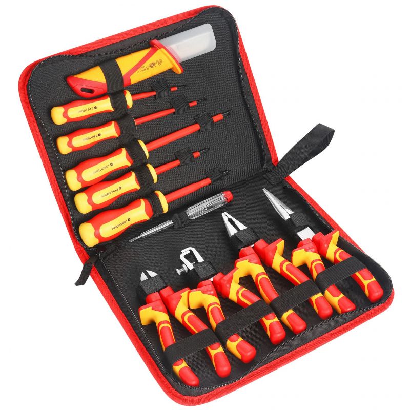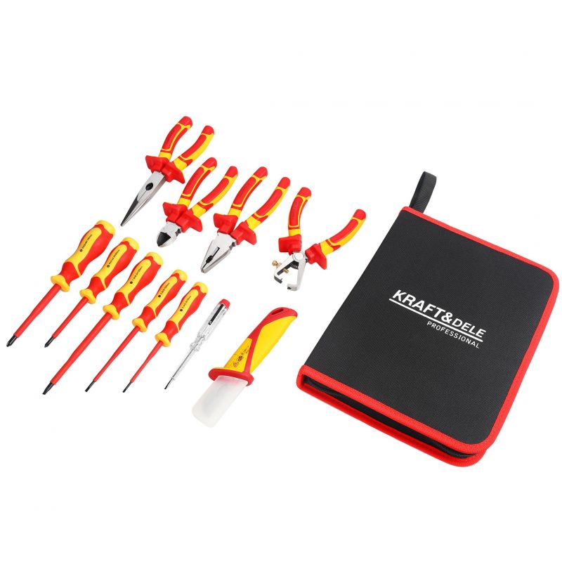 Setul de scule izolate, 11 buc | KD5970 conține un set complet de scule necesare pentru lucrul cu sisteme electrice sub tensiune. Este un echipament indispensabil pentru fiecare electrician. Toate sculele sunt fabricate în conformitate cu standardul VDE și sunt proiectate pentru lucrul în siguranță cu instalații electrice cu tensiuni de până la 1000 V. Izolația de înaltă calitate asigură protecție și o prindere sigură.