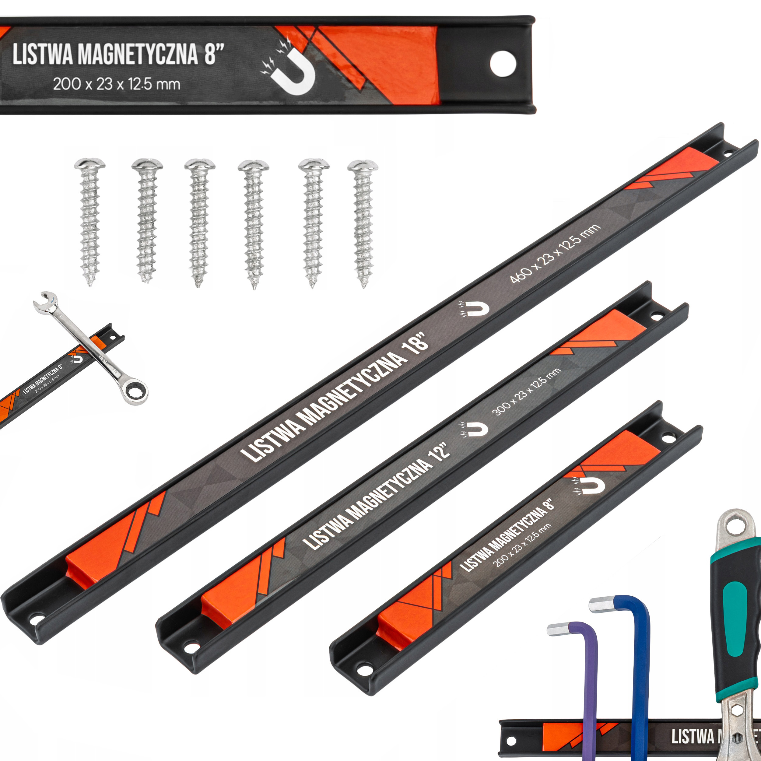 Șinele sunt disponibile în trei variante practice: 20 cm, 30 cm și 46 cm, ceea ce le face ușor de adaptat la spațiul dvs. de lucru. Lățimea îngustă de 23 mm face ca șinele să fie discrete, dar în același timp suficient de puternice pentru a susține scule de dimensiuni standard. Pentru obiecte mai grele, puteți utiliza două benzi în paralel, ceea ce crește semnificativ forța de atracție și siguranța fixării.