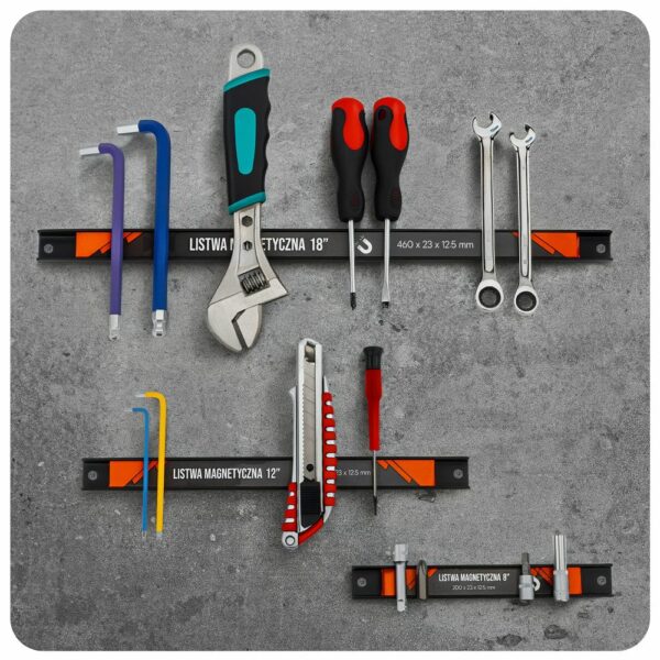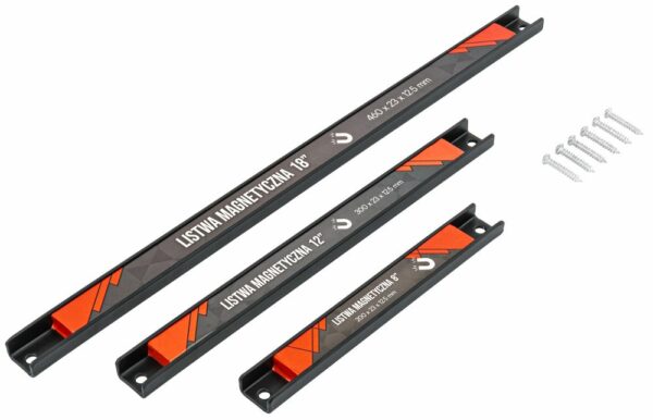 Șinele magnetice pentru scule, 3 buc | PM-LM-3T permit organizarea practică și depozitarea în siguranță a sculelor pe peretele din atelier sau garaj. Magnetul puternic încorporat generează un câmp magnetic stabil care fixează în siguranță cheile, șurubelnițele, cleștii și alte accesorii din oțel. Acest lucru previne alunecarea sau căderea sculelor în timpul lucrului, eliminând riscul de deteriorare și crescând confortul în utilizare. Având totul la îndemână, puteți organiza munca mai eficient.