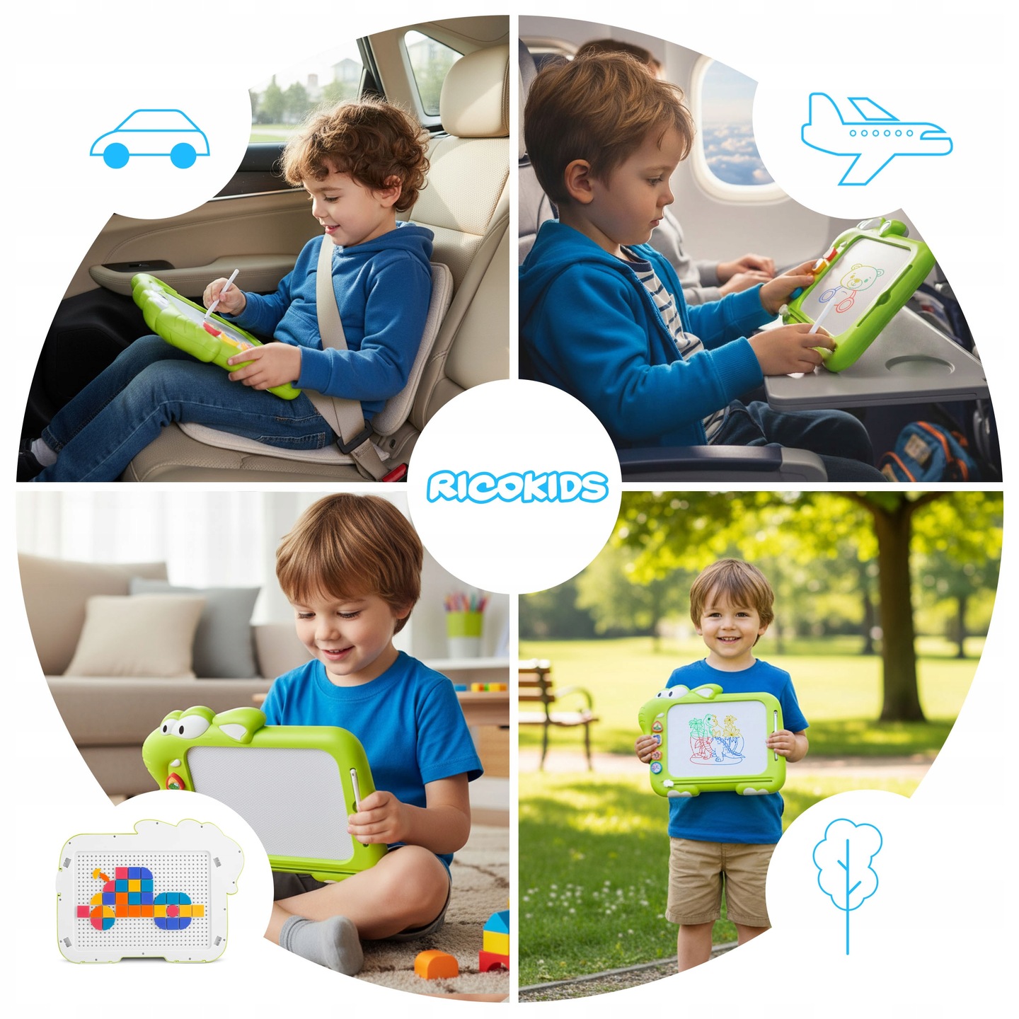 Tabla magnetică de desen pentru copii RK-823, verde | Ricokids oferă copiilor un joc creativ legat de spațiu, unde pot asambla și forme tangram. Este o jucărie creativă universală pentru copii, care combină funcțiile unei ștampile magnetice și ale unui puzzle tangram. Permite desenarea folosind un pix și ștampile magnetice, în timp ce imaginea poate fi ușor „ștearsă” cu o singură mișcare.