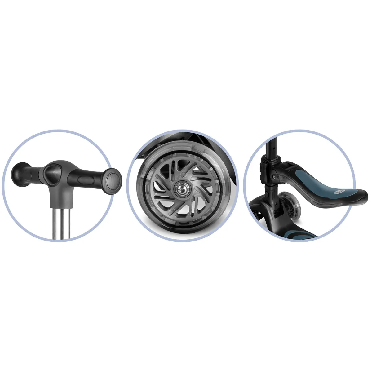 Virajul se face exclusiv prin echilibrarea corpului, fără a roti ghidonul. Înclinați-vă ușor în direcția dorită și ați terminat! Copiii stăpânesc rapid această tehnică de condus și își exersează simțul echilibrului. Trotineta rămâne stabilă la viraje datorită celor trei roți ale sale.