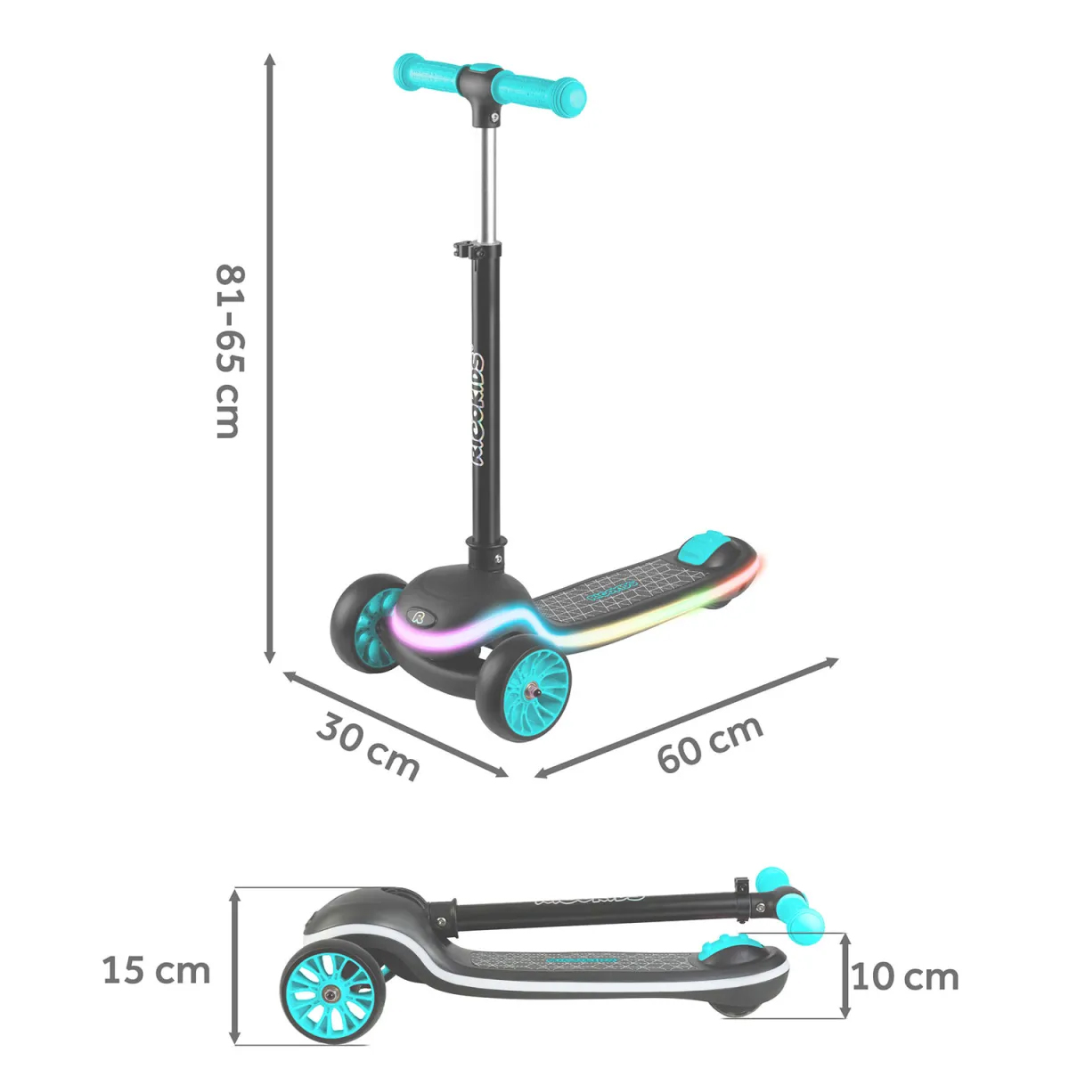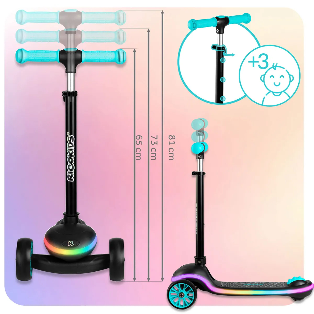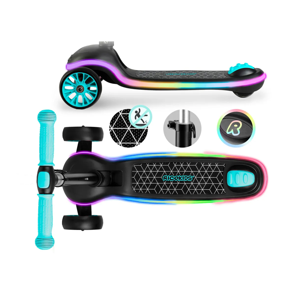 Trotinetă cu trei roți, negru-turcoaz, LED | Ricokids Leddi