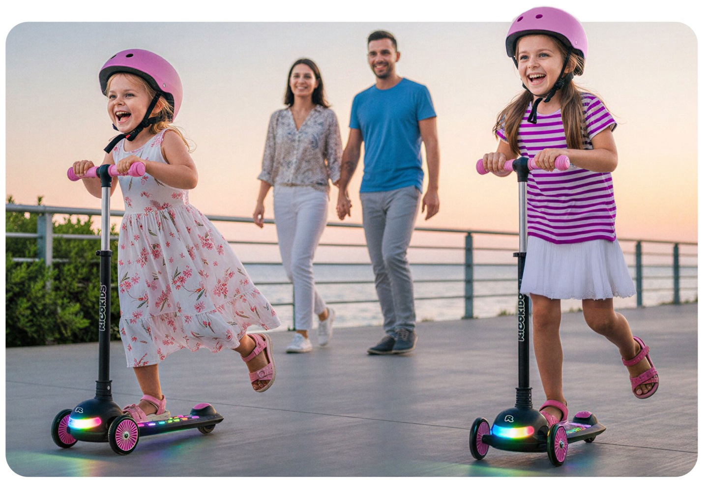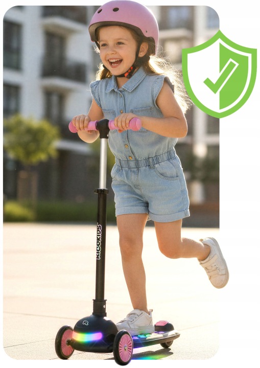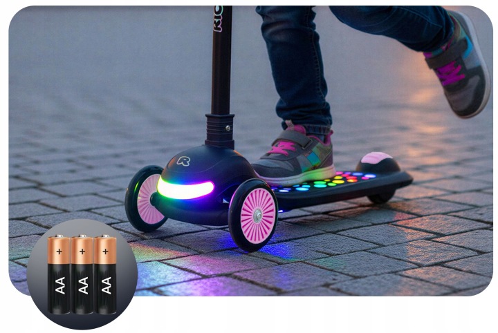 Trotinetă iluminată cu trei roți, negru-roz | Ricokids Glowi oferă o călătorie stabilă și un control ușor, susținând dezvoltarea echilibrului și a coordonării. Construcția ușoară permite o manevrare ușoară și un control bun în timpul mersului. Modelul este echipat cu elemente LED luminoase care sporesc vizibilitatea și, în același timp, fac mersul mai atractiv, în special în condiții de iluminare slabă.