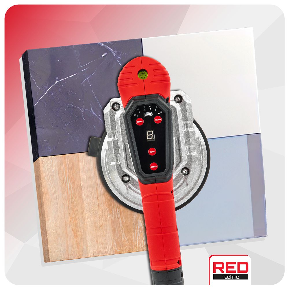 Ventuză vibrantă pentru plăci RTAPW0155, 21V | RED TECHNIC oferă o forță de aspirare de până la 100 kg cu vibrații reglabile pentru poziționarea precisă a plăcilor. Ventuză este ideală pentru placarea cu gresie, industria sticlei, construcții și tâmplărie. Este concepută pentru mutarea și instalarea suprafețelor netede – de la plăci și sticlă la plăci laminate – este un asistent indispensabil chiar și pentru profesioniști.